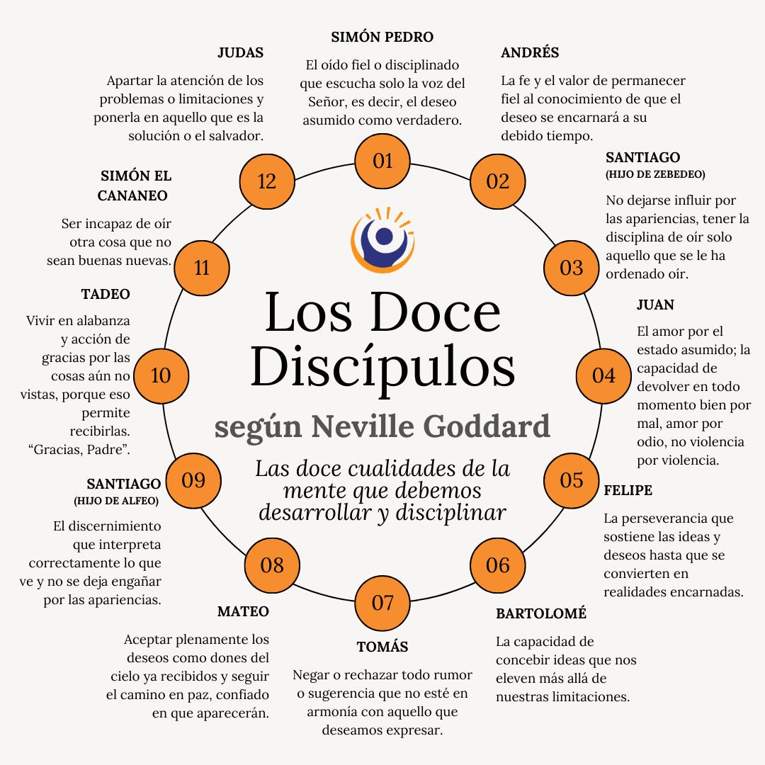 Neville explica que los doce discípulos no son personajes históricos que debemos admirar desde lejos, sino doce cualidades de la mente que debemos desarrollar y disciplinar.